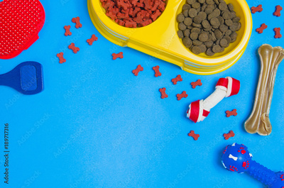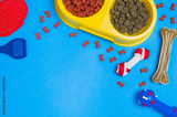 Dry dog food in bowl and pet accessories on blue background top view. Pet feeding concept backgrounds with copy space. Frame composition.