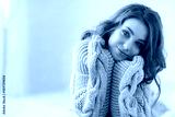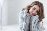 Cute young girl in a gray knitted sweater. Beautiful woman is relaxing in a white bedroom. Beautiful women in winter clothes are waking up in the morning. Woman wearing a sweater in a white bedroom.