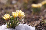 Crocus yellow grows in a spring garden in the snow. Beautiful primrose with drops of dew on a green background.