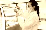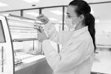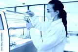 Medical scientist loading slide rack into automated stainer machine. Lab technician in protective gear processing histology samples in sterile hospital laboratory.