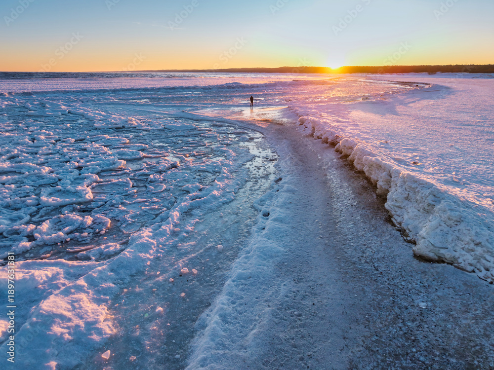 Ice toros on the Baltic Sea beach in Mikoszewo at sunrise. Poland