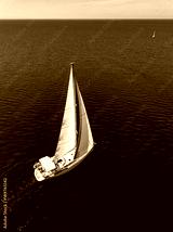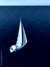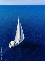 Aerial view from drone of white yacht in deep blue sea