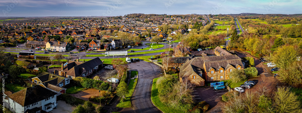 Drone aerial of Field Head village and suburban housing, Leicestershire UK