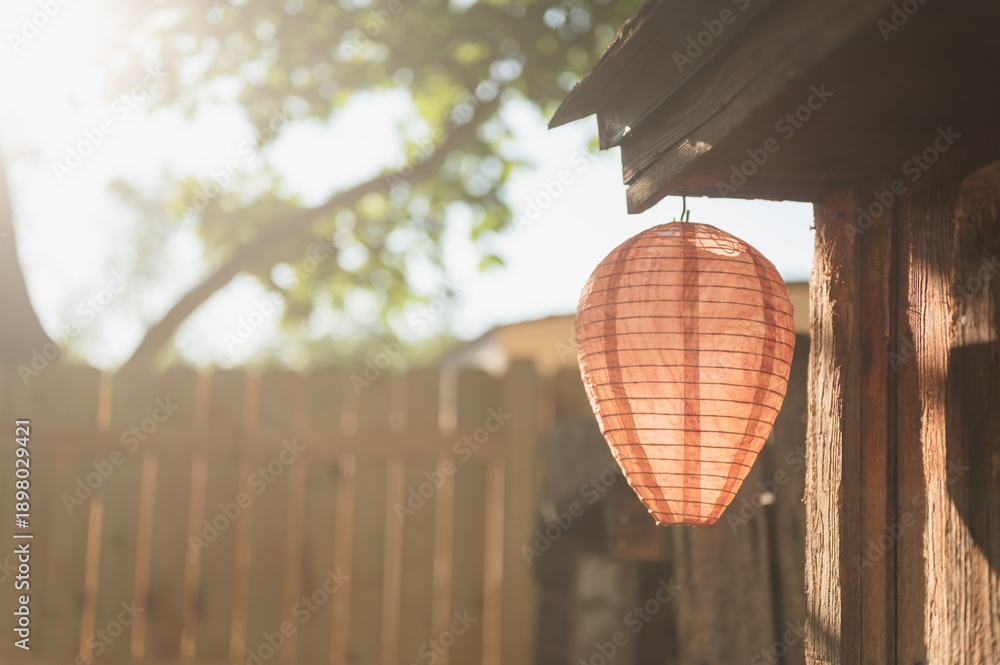 Wasp nest decoy on shed with sunlit backyard with copy space