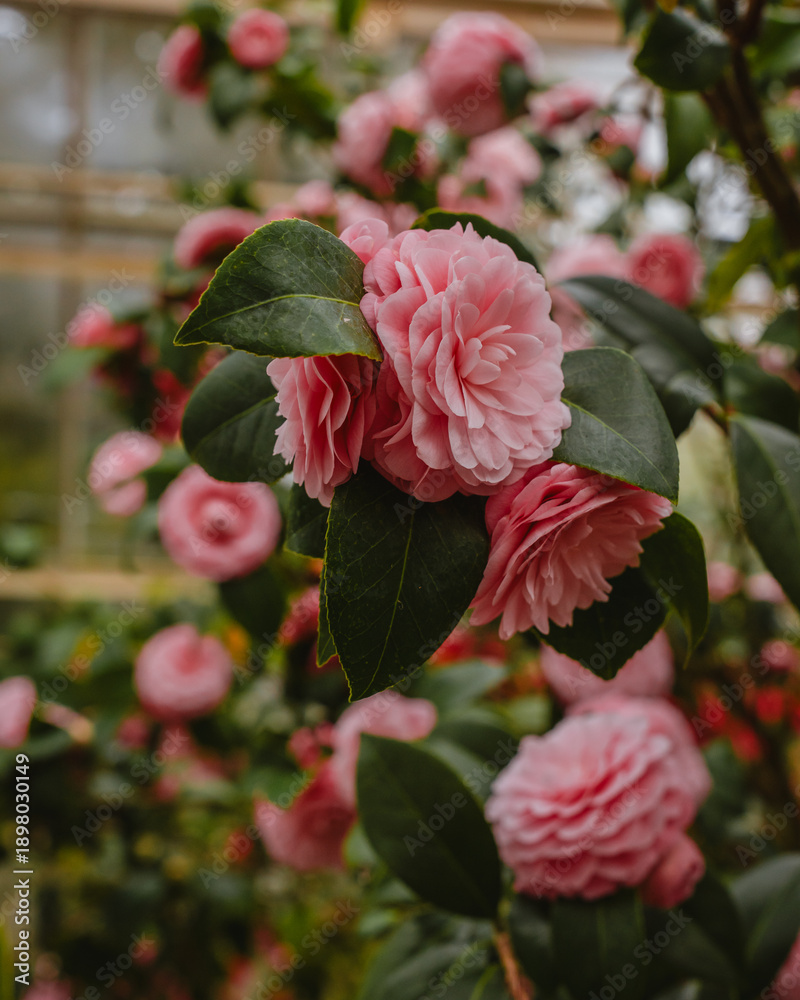 Bushes of Lush Pink Camellias in Blooming in Greenhouse