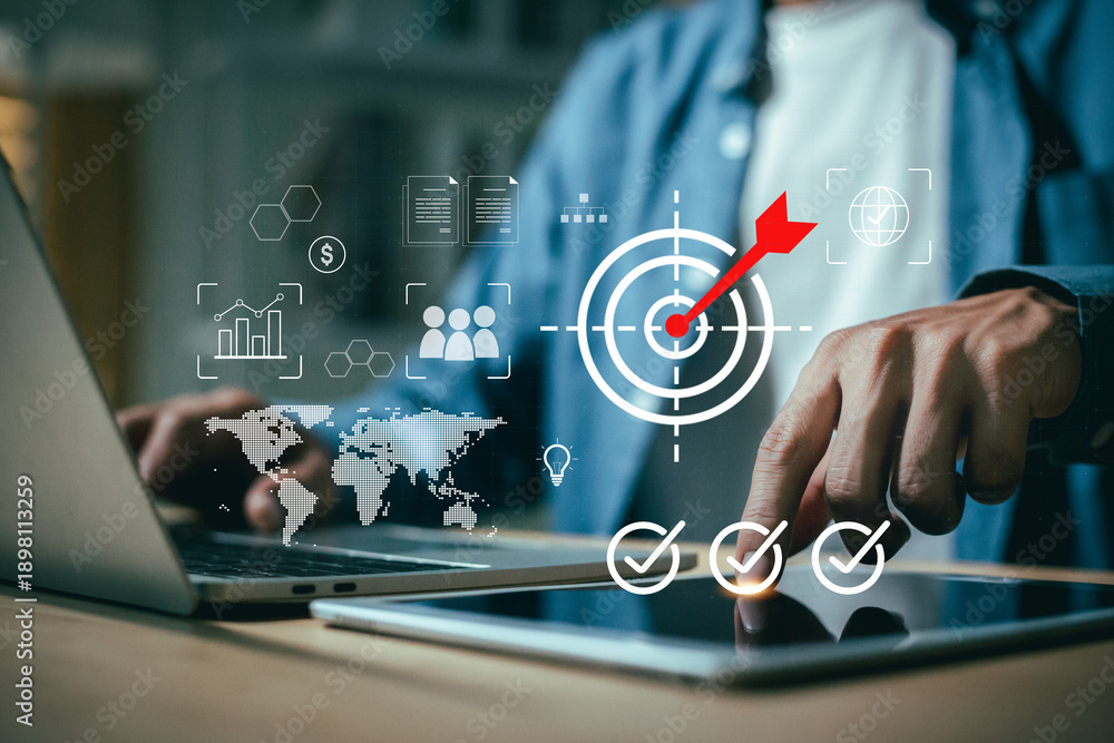 Digital Transformation and Business Success Concept: Businessman Analyzing Data and Achieving Strategic Goals on Virtual Interface.