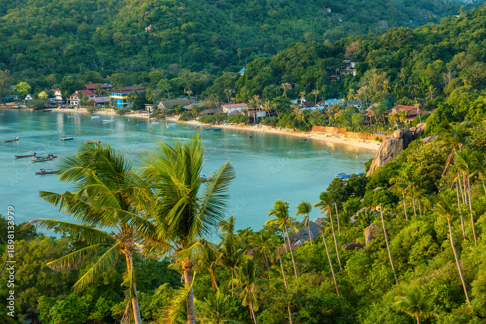 Aerial scenic view of sandy beach on Koh Tao island with palm trees, turquoise bay, beachfront houses and boats along the shore at sunset, Thailand. Travel destination for summer vacation
