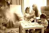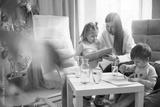 Children drawing and reading at table with mother at home. Concept of creative development, family education, focused activity, balanced screen free time, and supportive parenting.