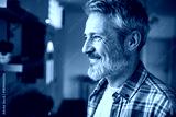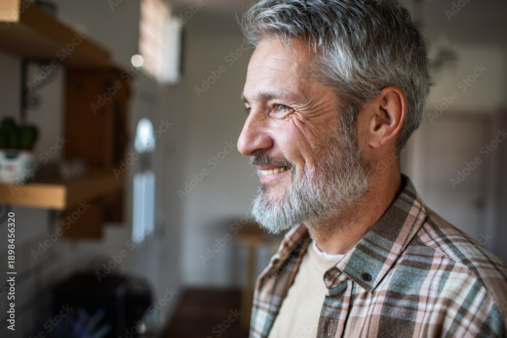 Smiling mature man with gray beard at home