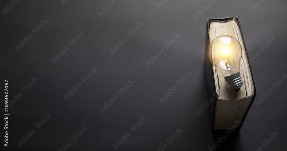 Light bulb and book on the black background.