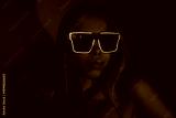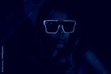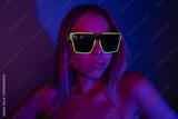 Young blonde woman wearing neon sunglasses in futuristic purple blue light. Confident cyber style portrait, glowing fashion aesthetics, modern nightlife mood, self expression and bold individuality