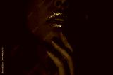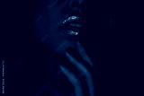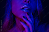 Close up of young blonde woman touching glitter lips with fingers in purple blue neon light. Sensual beauty concept with sparkling makeup, soft touch, intimacy and futuristic cyber aesthetic
