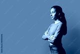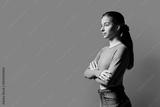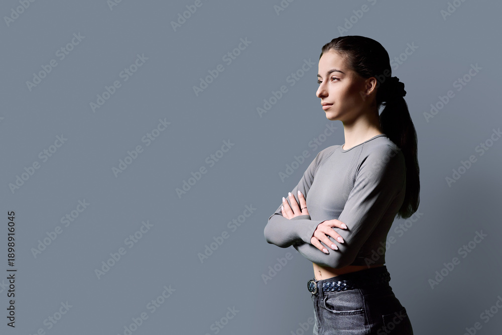 Portrait of beautiful serious young woman, 18-19 years old on gray background