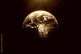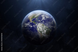 Planet Earth from space. Amazing blue planet Earth with world ocean, continents and clouds in outer space on a starry sky. View of the Earth, stars and galaxy. High resolution image.