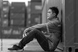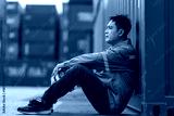 A tired logistics worker in a gray uniform sits on the ground at a busy shipping container yard, holding his safety helmet while resting after a long shift in the freight transportation industry.