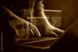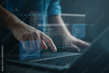 Developer working with code on laptop, virtual data interface, representing software development, programming, cybersecurity, data processing, system analysis, modern information technology concept.