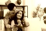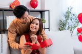 Happy asian man giving heart gift box to girlfriend celebrating Valentine's Day or anniversary together at home, young couple in love with joyful surprise present, relationship and bonding.