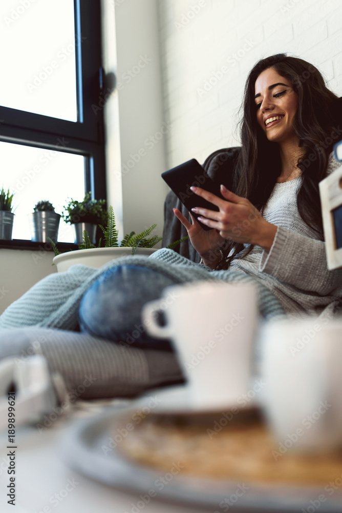 Beautiful young woman at home drinking coffee reading a book