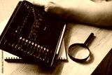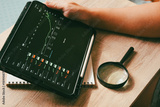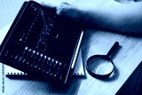 Close up of businessman holding tablet with stock market charts, analyzing financial data with magnifying glass on wooden desk.