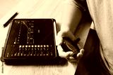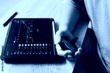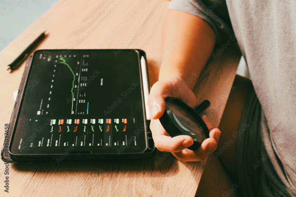 Person holding magnifying glass analyzing financial stock market charts on tablet, concept of investment research and data verification.
