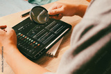 Close up of person hand holding magnifying glass to analyze stock market data on digital tablet, concept of financial research and investment inspection.