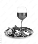 Tray, Grissini with tasty jamon, figs and glass of red wine isolated on white background