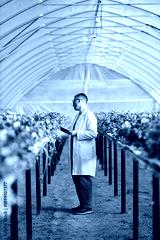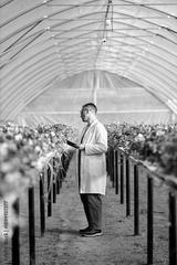 Vertical shot of Caucasian young adult man wearing lab coat standing in greenhouse inspecting plants while holding digital tablet, surrounded by rows of cultivated greenery under transparent roof