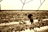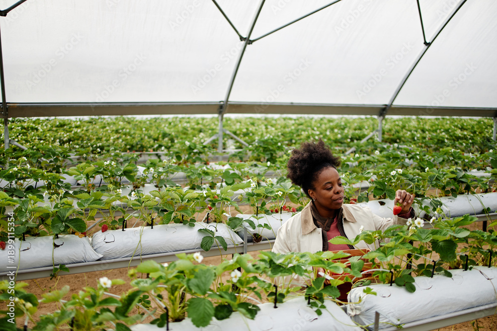 Black woman young adult inspecting strawberry plants in greenhouse, carefully examining leaves and fruit, surrounded by rows of cultivated crops under transparent roof structure