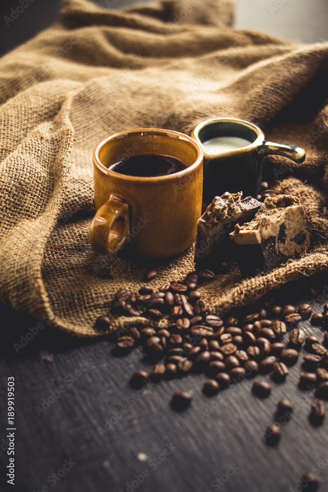 Black coffee Arabica In brown glass And milk and dessert Sack background in low light area