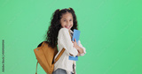 Book, child and student on green screen in studio with mockup space, learning and smile for growth. Happy kid, cute girl and learner with backpack, future development and portrait on background