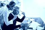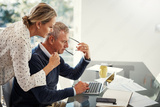 Finance, couple and support with laptop in home for debt solution, financial planning or track expenses. Space, mature people and serious with tech for loan application and review emergency savings