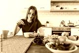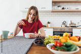 Young beautiful woman eating fruits and vegetables healthy food in kitchen.