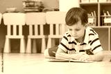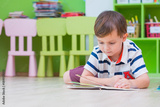 boy kid lay down on floor and reading tale book in preschool library,Kindergarten school education concept
