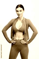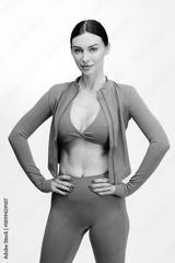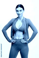 Fit woman in blue sportswear poses confidently with hands on hips, showcasing athletic physique against a plain light background
