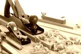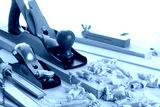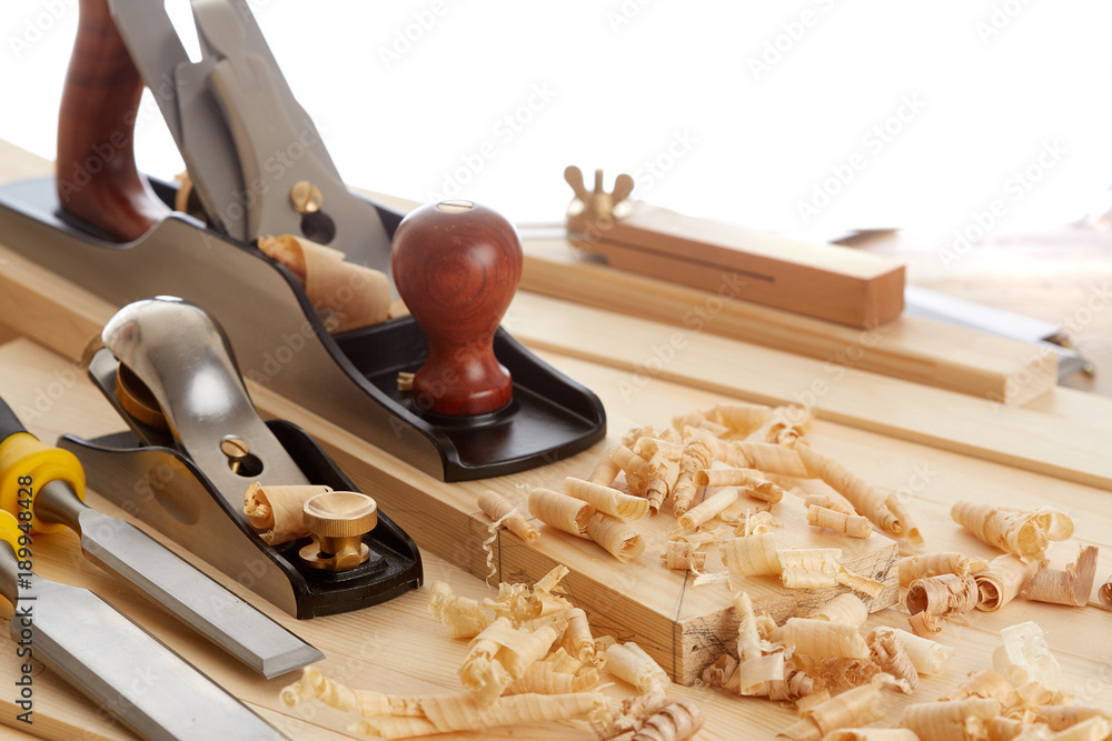 DIY concept. Woodworking and crafts tools. Carpentry hand tools. Planers, chisels, saw, measuring tools. Wooden background. Isolated on white.