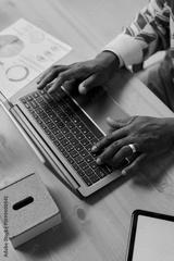 Black man typing on laptop at desk, hands with wedding ring, working on project with financial charts and tablet nearby, adult engaged in professional activity