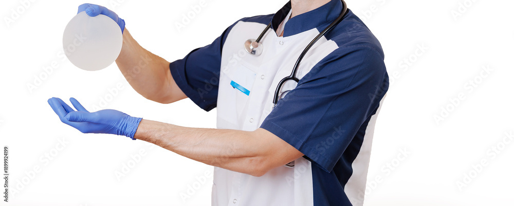 Plastic surgeon holding silicone breast implant in medical clinic environment, white background banner