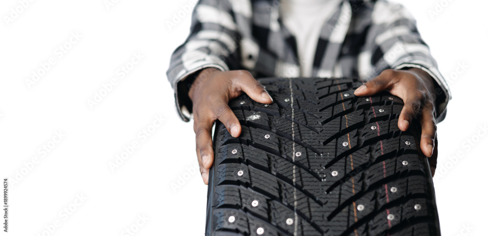 African male hands holding winter tire isolated on white background with copy space
