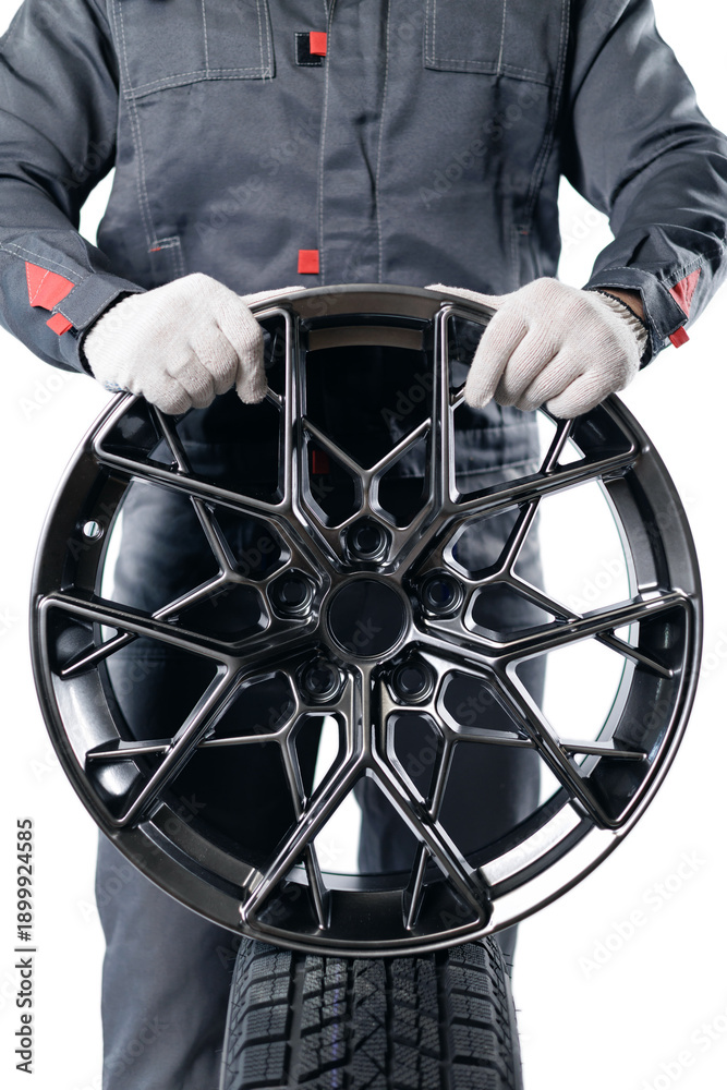 Male auto mechanic holding alloy wheel rim with gloves in garage setting