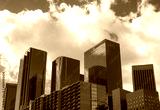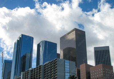 Buildings in the LA skyline on Bunker Hill in downtown Los Angeles viewed from below on Hill Street against a blue sky with white clouds