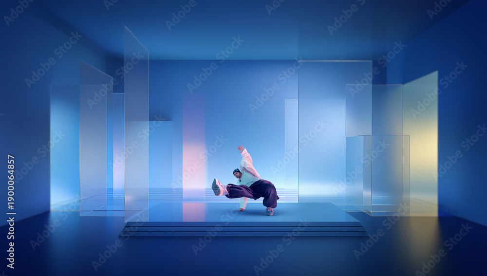 Clean composition breakdancer posing among translucent panels. Concept of architectural abstraction, fashion performance visuals, modern design concepts, and creative branding projects.