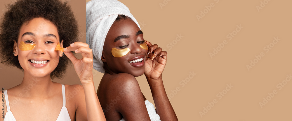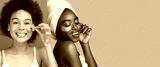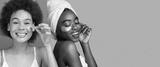 Two women perform beauty rituals with face masks at home. One woman is smiling while applying a mask, and the other is showing off her mask with joy. The setting has a simple, warm backdrop.