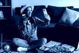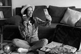 Smiling woman taking selfie with passport on cellphone while sitting near open suitcase, preparing for trip