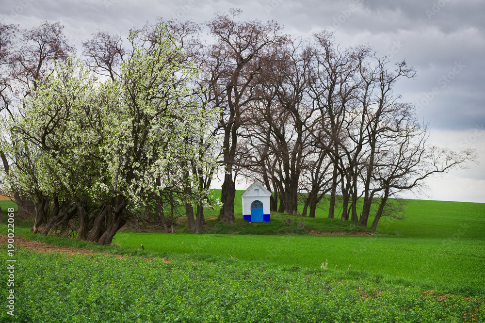 Santa Barbara chapel landscape at spring, South Moravia, Czech Republic. Chapel in a field surrounded by trees with dramatic cloudy skies.