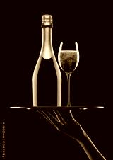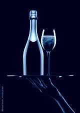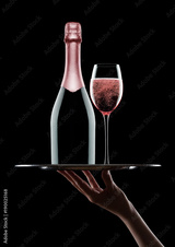 Hand holds tray with pink rose champagne glasses