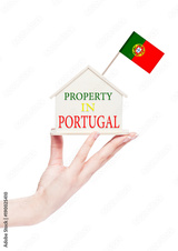 Female hand holding wooden house model with flag