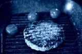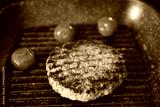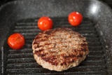 Delicious grilled patty and tomatoes on grill pan, closeup