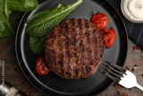 Delicious grilled meat patty, tomatoes and spinach on wooden table, flat lay