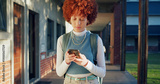 Phone, typing and student at school for education with networking, texting and contact on mobile app. Reading, technology and girl teenager with cellphone for communication at academy for learning.