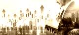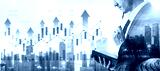 A businessman in a suit studies stock market trends while holding a book. The background features upward graphs and a vibrant city skyline, symbolizing economic growth. Scalp